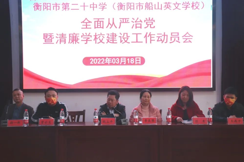 为扎实推进“清廉校园”建设,努力实现清明政风、清净校风、清正教风、清新学风的良好校园生态和发展环境,2022年3月18日上午,衡阳市第二十中学(船山英文学校)在小学部党员活动室召开全面从严治党暨清廉学校建设工作动员大会。校长欧立平、校党总支书记李良慧、校党总支纪检委员彭青、副校长尹春、曾云生、王再平、颜一新、学校各部门中层副职以上干部、党建专干、纪检专干参加了会议。此次会议由纪检员彭青主持。 会上,彭青书记传达了3月7日全市教育系统全面从严治党暨清廉学校建设工作会会议精神,组织学习了中共衡阳市委清廉衡阳建设领导小组办公室印发的《衡阳市清廉学校建设工作方案》(衡清学校[2022]1号)、衡阳市人民政府副市长谢宏在此次会议上的讲话、衡阳市教育局党组书记、局长程少平代表局党组作全面从严治党主题的发言和市纪委监委驻市教育局纪检监察组组长李青山的全面从严治党的工作报告,认真分析了“清廉学校”建设的必要性和紧迫性,宣读并讲解了我校关于《衡阳市第二十中学(船山英文学校)清廉学校建设工作方案》,介绍了众多试点校特色鲜明的具体建设举措。她强调,清廉学校建设是贯彻市委决策的重大举措,是新时代教育事业高质量发展的重要保障,是纵深推进全面从严治党的基本要求,希望通过“清廉学校”的建设,形成崇清尚廉的风气,使清廉风气渗透到学校的方方面面。