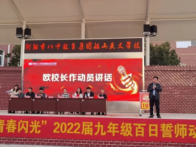 阳春三月,万物向荣。2022年3月10日上午7:30,衡阳市船山英文学校2022年中考百日誓师大会在足球场举行。 本次大会由刘茜老师主持,学校领导和初三年级全体师生参加了会议。随着五星红旗在庄严的国歌声中徐徐升起,誓师大会拉开了帷幕。 总校欧立平校长和曾云生副校长作动员讲话。欧校长深情寄语,希望同学们在最后的100天里,向梦而行,持梦有恒,逐梦自律,行梦自省。曾校长叮嘱同学们要“确立奋斗目标,树立必胜的信心,讲究学习方法,珍惜每分每秒。”领导们温暖如春的叮嘱,意义深远的教诲,满怀激情的发言,极大地鼓舞了全体初三师生冲刺中考的信心与决心。