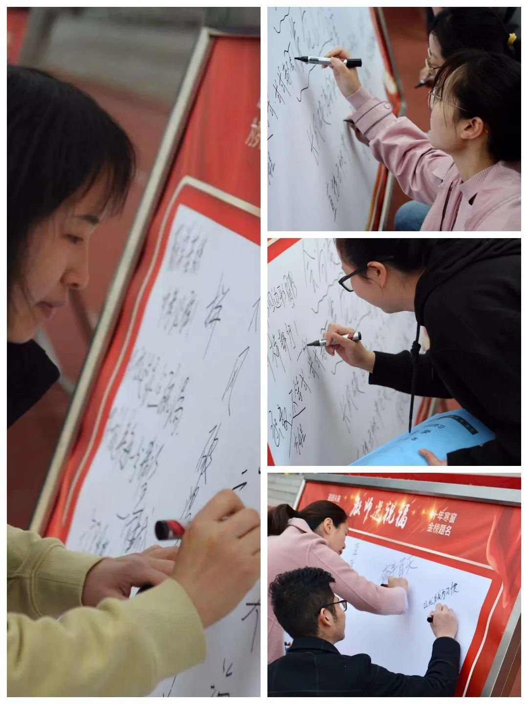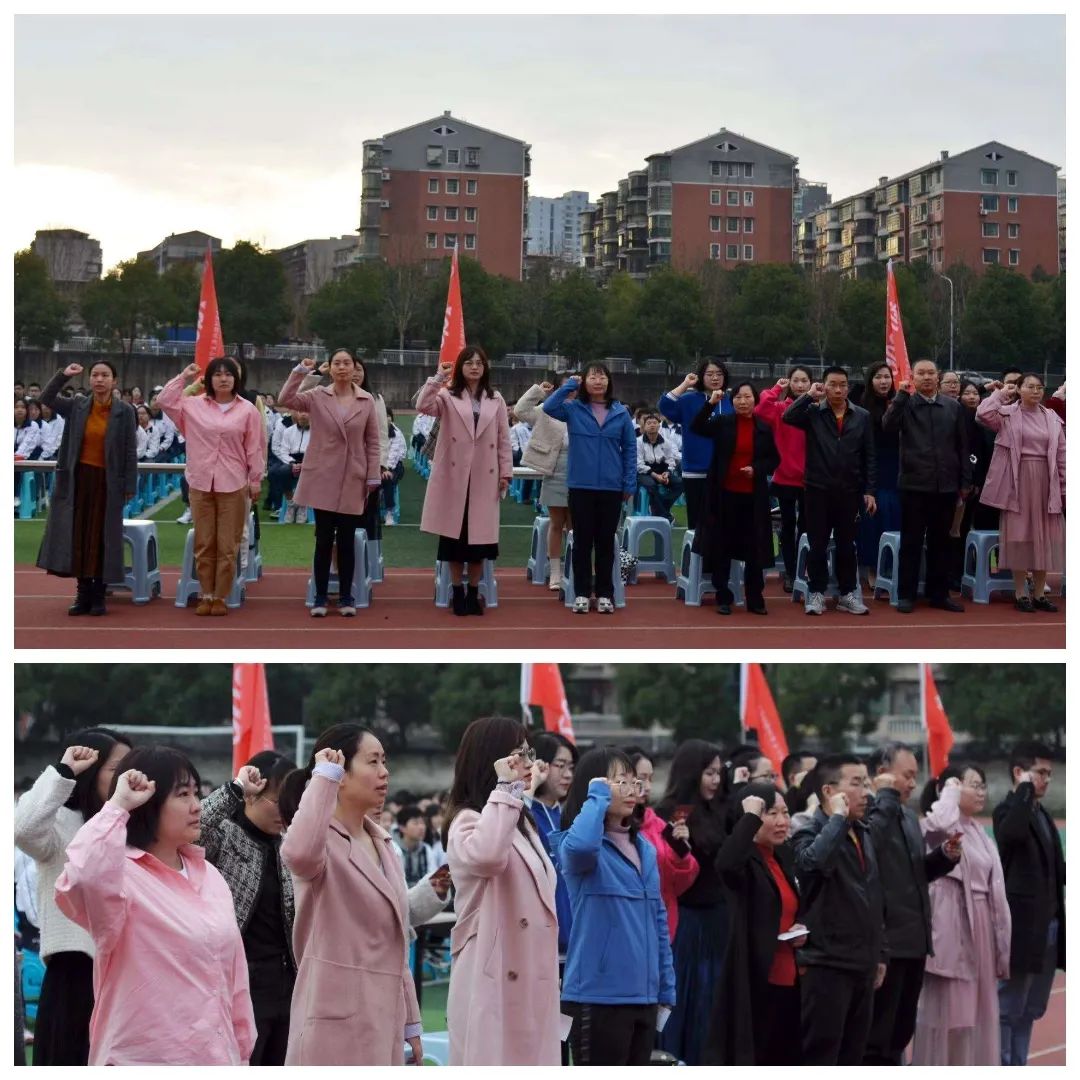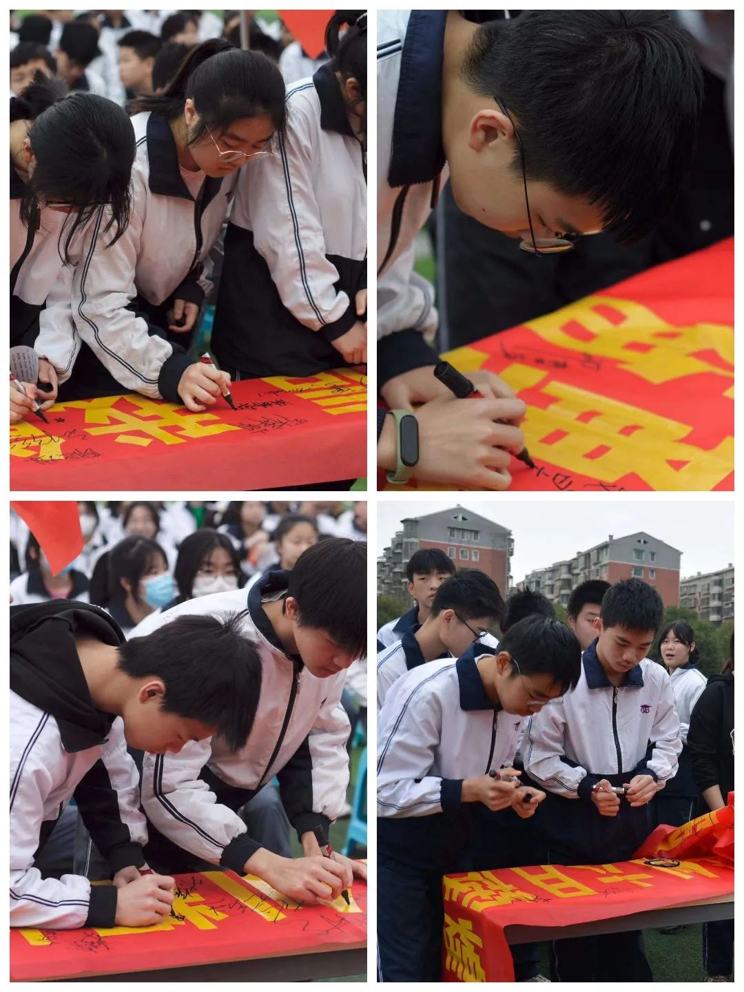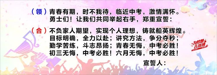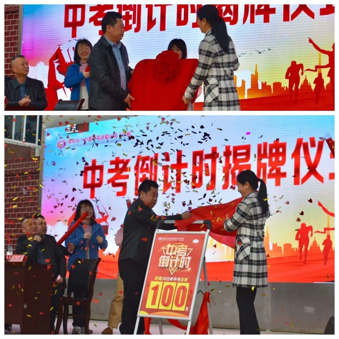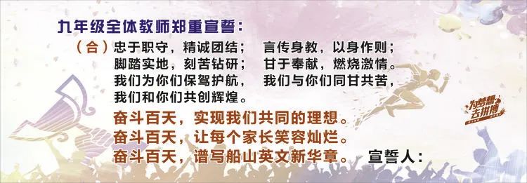 春风正劲,礼花放彩。总校欧立平校长和党支部李良慧书记共同为“百日中考倒计时牌”揭牌,中考冲刺的号角正式吹响。 在热烈的掌声中,校领导为各班授中考倒计时牌,希望大家时刻警醒自己,珍惜有限的时间,续写船英辉煌。 接下来陈蓓老师作为教师代表发言,表明了初三全体教师与学子们共甘共苦力创辉煌的共同心声。“我们愿做大家冲刺路上的加油站,愿做大家中考信息的查询台,愿做大家的心理咨询师,愿为大家诊断学习中碰到的一切疑难杂。 随后,各位领导和初三全体教师在留言板上现场签名送祝福。留言板上金句频频,祝福绵长,为学子们未来100天的奋斗注入了新的动力。 紧接着播放各班家长代表讲话的视频。家长们深深的祝福和期许,暖心的鼓励与信任触动着孩子们的心弦,成为初三学子百日冲刺不竭的动力。 1904班阳思宇同学作为学生代表发言,表明了全体九年级学生将全力以赴决胜中考的决心与信心。 决胜中考是学校的重托,是学生的心愿,是家庭的希望,是社会关注的焦点。同心同德、精诚合作、无私奉献是九年级教师一贯的作风。百日在即,全体教师立下铮铮誓言。教师的激情感染着全体学生,全体初三学子举起右手,以青春的名义庄严宣誓。 必胜之心,烙字为铭。学子们在班级横幅上烙下自己的中考目标并郑重签名。签名活动结束后,各班分班宣誓。足球场上,各具特色的铮铮誓言此起彼伏,青春的激情在呐喊中燃烧。 接下来的分班拔河挑战赛将大会推向了高潮。全场的欢呼声、呐喊声、加油声一浪高过一浪,同学们勇于拼搏的精神为未来100天的冲刺注入了新的力量。 此次大会在《我相信》的合唱声中拉上帷幕。“我相信我就是我,我相信明天,我相信青春没有地平线。”相信船英全体初三少年会在2022年的六月踏山归来传捷报,不负青春题金榜。