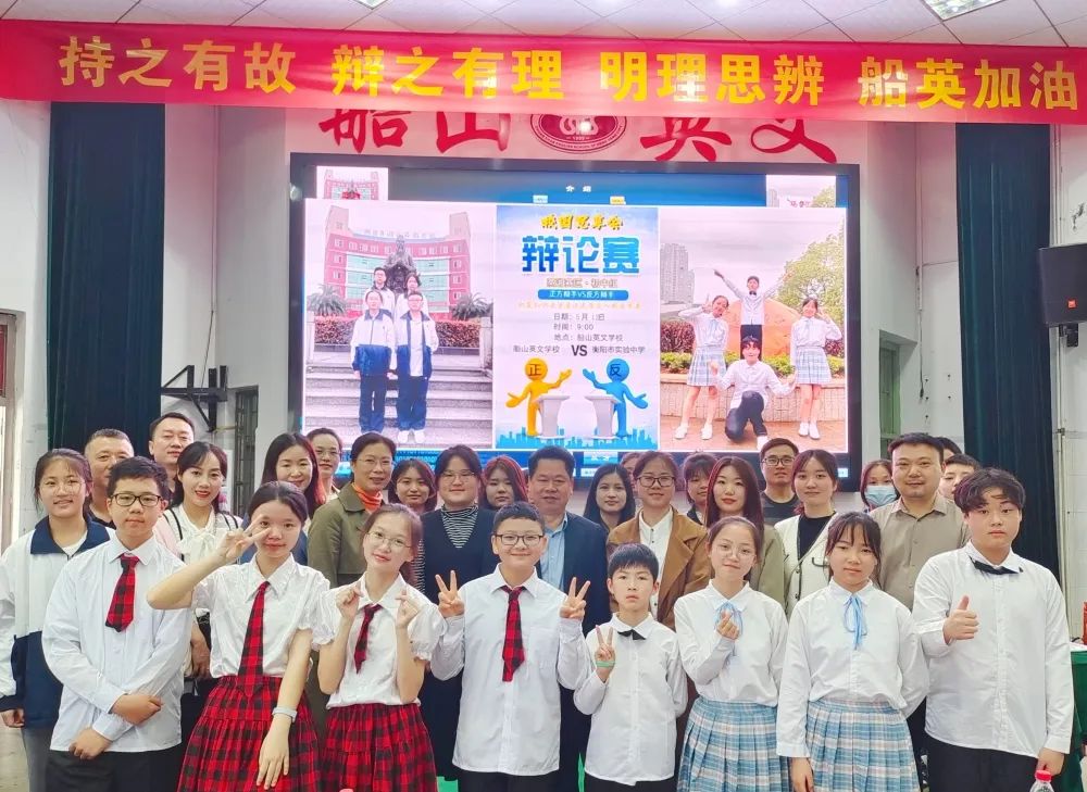 场上寸步不让,场下惺惺相惜。比赛双方队员合影留念,记录下成长的精彩瞬间。 赛后,衡阳市船山英文学校校长欧立平深情寄语,他认为衡阳市教育局组织全市中小学思政辩论赛是人才培养的一大善举,也是一大盛举。他希望我们的青少年以辩论赛为契机,认真落实习近平总书记关于办好思政课的教育工作要求,不断提升思想高度和深度,全面提高逻辑思维能力、语言组织能力和团队合作能力。既积累知识,又塑造人格,勾画人生精彩图景,做中国梦的德才兼备的时代担当者!