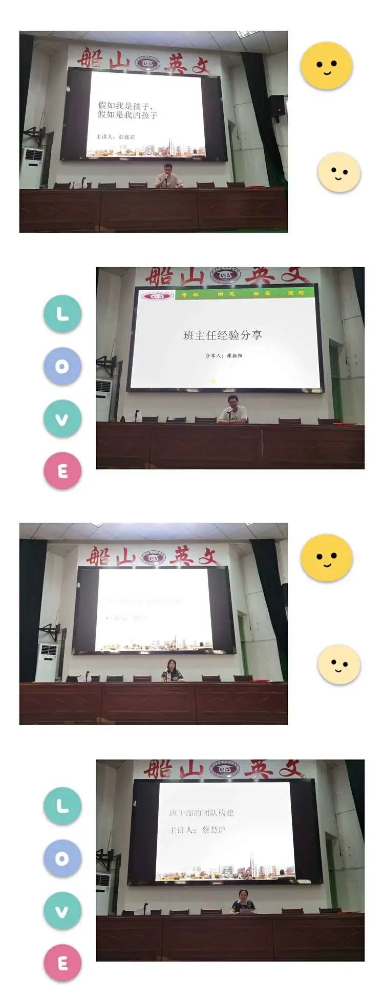 各学部优秀班主任分享各自带班心得:高中部彭嘉宾老师认为要学会蹲在孩子的位置思考问题,时刻记住“假如我是孩子,假如是我孩子”;初中部廖振阳老师强调要用“心”从业,以博爱对待孩子。从“实”授业,以求实效赢得好成绩;小学部周婧芳老师提出建立在巧妙策略上的赏识与激励可以有效地帮助孩子建立自信心;初中部蔡慧萍老师分享了如何构建有效的班干部团队。