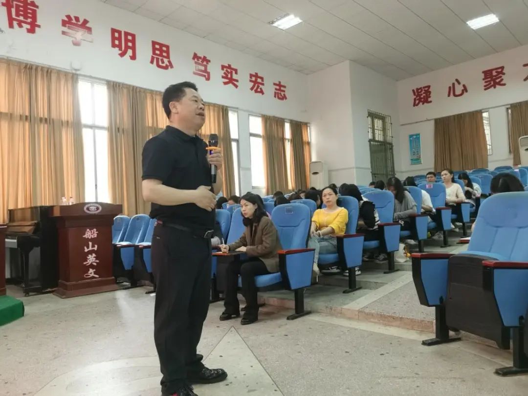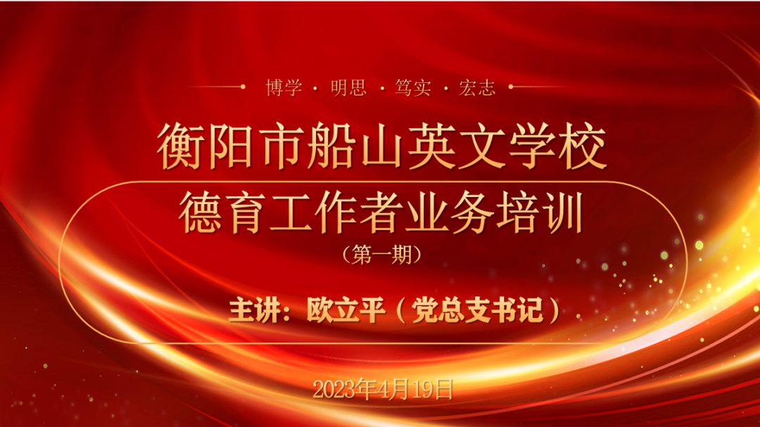为深入贯彻党的二十大会议精神,全面落实“立德树人”根本任务,发挥领导团队的引领示范作用,增强我校教师教书育人的责任感和使命感,2023年4月19日下午,衡阳市船山英文学校组织开展了本学期第一期德育工作者业务专题培训。 教育以德育为本,育人以德育为先 一言一行,凝爱心雨露育蓓蕾;精雕细琢,引真知灼理启人生。本次培训学校由学校德育部门负责组织,党总支书记欧立平同志亲自主讲,学校全体德育工作人员参与学习。