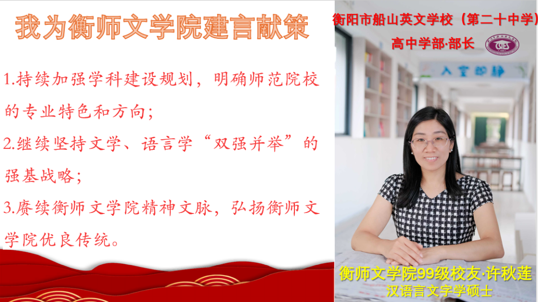 作为本次受邀参与“衡师百廿校庆”•文学院校友论坛的单位,我校高中部师生纷纷表达最美好的祝愿。我校语文学科带头人、王再平副校长带领骨干教师团队、优秀学生代表,一齐祝贺衡阳师范学院“百廿风华育人才,南学津梁创辉煌”;99级校友、高中学部的许秋莲部长,还以“持续”、“继续”和“赓续”为关键词,向衡阳师范学院文学院积极建言献策。未能当天到场者,也在“线上云端”送达了自己的心愿。