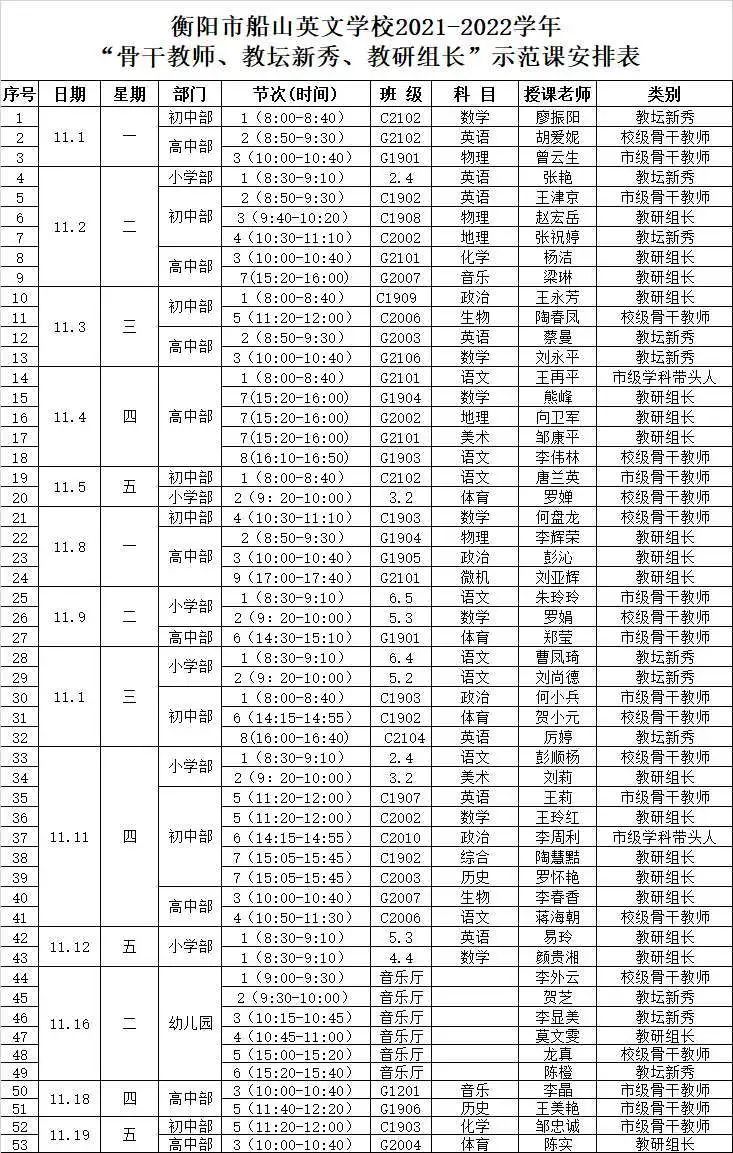 “名师示范增智趣,双减课堂辟新渠。”为全面落实“双减”工作要求,贯彻课堂变革理念,充分发挥学校骨干教师、教坛新秀、教研组长等教师的示范引领作用,衡阳市船山英文学校教师发展中心于11月1日~11月19日组织了为期三周的名师示范课活动。 骨干示范 引领成长 在船山英文学校有这样一群人,他们是教育教学和教育科研的先行者;他们拥有丰富的一线教育教学经验;他们对教育教学有着深刻而独到的见解;他们在提升自我同时还引领着其他的老师一同成长。曾云生、王再平、李周利等23位骨干教师为我们带来了23节精彩纷呈的高质量示范课。 教坛新秀 锋芒初露 虽然他们走上讲台的时间不长,但他们凭借着扎实的教学基本功,凭借着勤于实践的工作理念,凭借着学无止境的工作态度,在教学岗位上快速成长。张艳老师等11位教坛新秀利用本次示范课活动平台,秀出了锋芒,收获了肯定。 学科教研 绽放精彩 教而不研则浅,研而不教则空。一节好课的诞生离不开教研组反复地推敲,不断地打磨,也离不开一位优秀的教研组长的组织与领导。19位来自4个学部12门学科的教研组长依次为我们展示了他们的学科自信与学科理念。 “博观而约取、厚积而薄发。”为期三周的示范课展示出风格各异、精彩高效的同时,还积极地响应国家号召,力促“双减”政策落实,以立德树人为根本任务,在核心素养、课堂常规、学习习惯、教学效率等方面,为不同学段、不同学科的青年教师们指明了课堂教学如何“减负增效”的方向,从整体上示范了如何提升课堂教学质量。船山英文学校将会继续秉持“从实践出发,从行动开始”的工作精神,扎扎实实地推进“双减”,为教研赋能,为学生的成才助力! 示范课展示详情表
