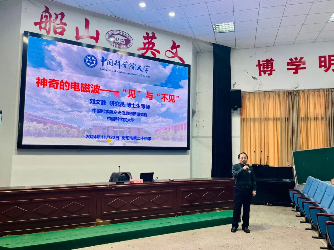为激发学生的创新思维,提升他们的创新能力,11月22日下午,衡阳市第二十中学(船山英文学校)特邀中国科学院空天信息创新研究院研究员、中国科学院大学岗位教授、博士生导师刘文鑫教授来校讲座,讲座由校长曾云生亲自主持。刘教授从微观世界巧妙揭开“神奇电磁波”的神秘面纱,引领同学们从俯视的角度,打开物理的大门。