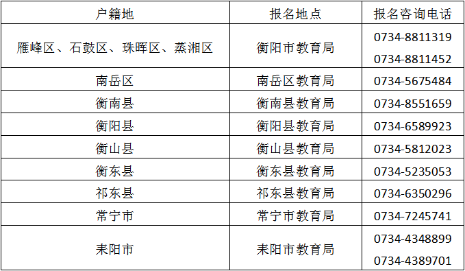回衡参加初中学业水平考试的公告 根据《关于认真做好2022年衡阳市初中学业水平考试工作的通知》(衡教通[2022]29号)文件规定,为方便属我市户籍但在外地就读的学生回我市户籍地报名参加初中学业水平考试(以下简称“中考”),现就相关事项公告如下: 一、报名对象:属本市户籍但未在户籍地就读的2022届初三应届毕业生及未取得高中学籍的往届初中毕业生。 二、报名时间:2022年5月9日—13日 三、报名办法:符合报名条件的考生或监护人携带考生本人居民身份证、户口薄及加盖学校公章的学籍证明到指定报名点录入信息并现场确认。有报名意向的考生要提前联系报名点,了解当地疫情防控要求,并严格遵守当地的疫情防控政策。 四、报名地点及咨询电话: