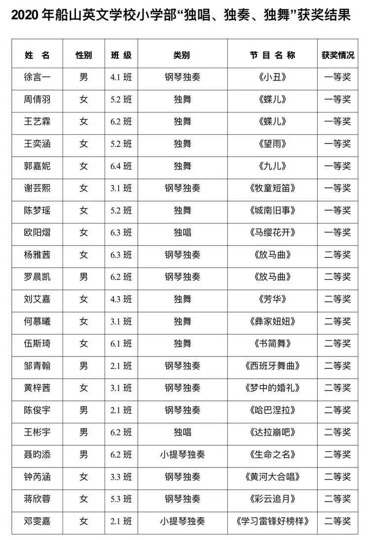 为全面落实素质教育,深入推进校园文化建设,进一步优化学校艺术教育教学,同时,为选拔优秀艺术特长学生参加衡阳市“三独”比赛,全面展示我校小学生艺术风采,10月16日下午,衡阳市船山英文学校小学部举行了“独唱、独奏、独舞”预选赛。 ♦️刘曦主任致词,为比赛拉开序幕♦️ 选手们有序地候场准备着☺️ ♦️小主持人介绍此次比赛的评委组♦️ 比赛采用现场抽签形式确定选手的出场顺序,为保证比赛公正、公平、公开的原则,组委会聘请专业评委进行现场打分。 ♦️评委们在认真地进行评分♦️ 赛场上,小选手们沉着冷静,勇敢绽放自我,为我们带来了视觉与听觉的双重盛宴。一起来看看他们的精彩表现吧! “声”入人心 独唱赛场上,选手们精神抖擞,用清脆、悦耳的声音演绎美好生活。 “乐”音绕梁 独舞赛场上,选手们精心装扮,舞姿或肆意奔放,或婉约舒展,或旋转跳跃,传递着舞蹈无声的美。 经过激烈的角逐,徐言一等8名优秀选手脱颖而出获得一等奖,并被选送市级参赛,杨雅茜等11人获二等奖。小学部王可可校长、谢琳副校长一起给获奖选手现场颁奖并合影留念,对以上获奖学生表示祝贺! 一等奖 二等奖 本次比赛充分体现了我校艺术教育的育人功能,检验了我校艺术教育的阶段成果,选手施展才华,展现艺术魅力,张扬青春活力,用艺术点亮生活,用才艺展示自我,激励学生互相学习,不断追求艺术美、创造艺术美。 我们期待船英学子能够在衡阳市“三独”比赛中一展风采,再获佳绩。 编辑:杨钰 徐明珠 责编:王柯玲 三审:欧立平 彭青 王再平