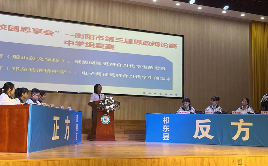正方衡阳市船山英文学校辩论队和反方祁东县洪桥中学辩论队围绕“纸质阅读更符合当代学生的需求/电子阅读更符合当代学生的需求”展开辩论。赛场上,双方辩手唇枪舌剑、妙语连珠,通过事实、数据和逻辑推理,用语言碰撞出思想的火花,为观众们呈现了一场高质量、高水平的视听盛宴。