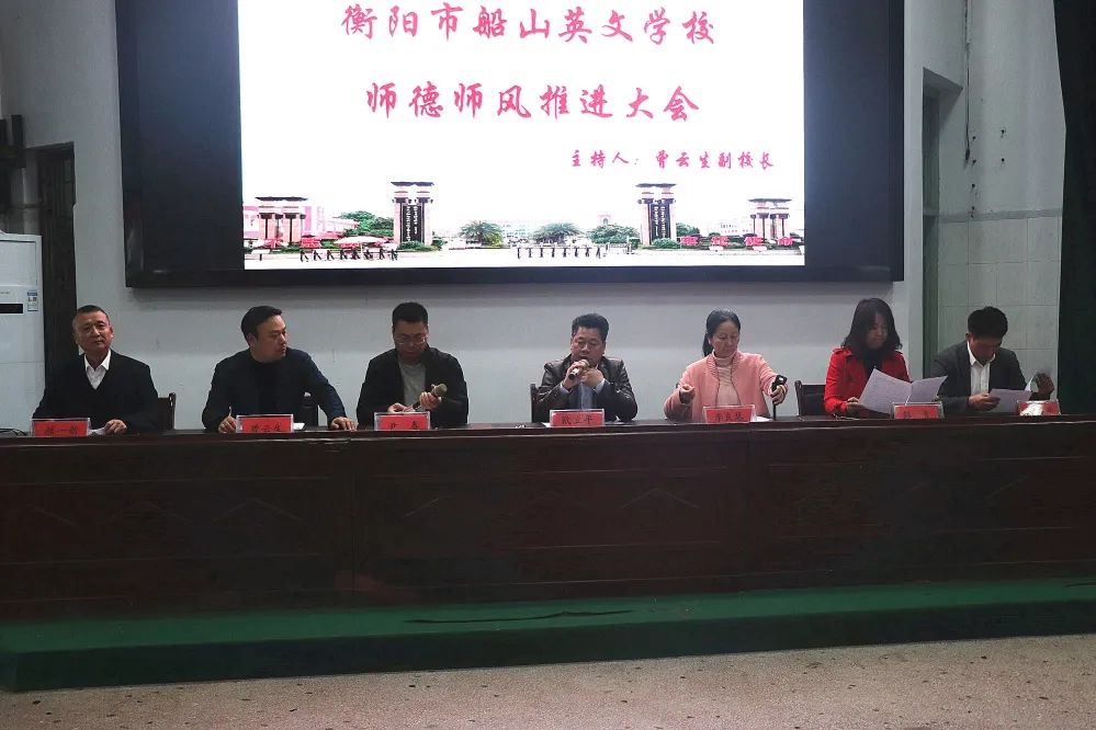 “我是光荣的人民教师,我宣誓:我一定忠诚党的教育事业,为人师表,敬业爱生,严谨治学,乐于奉献,修身立德。我一定遵守《中小学教师职业道德规范》,廉洁从教、文明执教,优质施教,不断提升个人师德修养,为使自已成为师德高尚、教风正派、业务精良、人民满意的高素质教师而努力!为实现中华民族的伟大复兴而奉献自已的智慧和力量!”十一月十九日下午衡阳市船山英文学校响彻铿锵的声音,这是学校全体教职员工在校纪检员彭青的带领下在学校会议室举行师德师风教育的宣誓仪式。一份承诺,一份责任;一份宣誓,一份使命;宣誓仪式庄严而鼓舞人心。