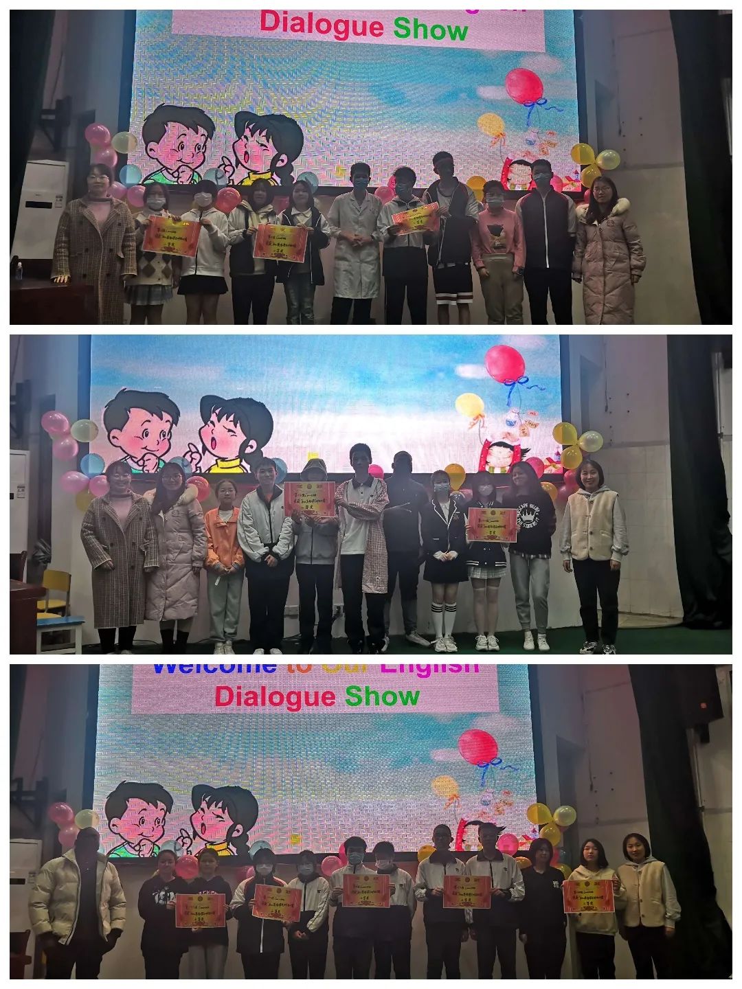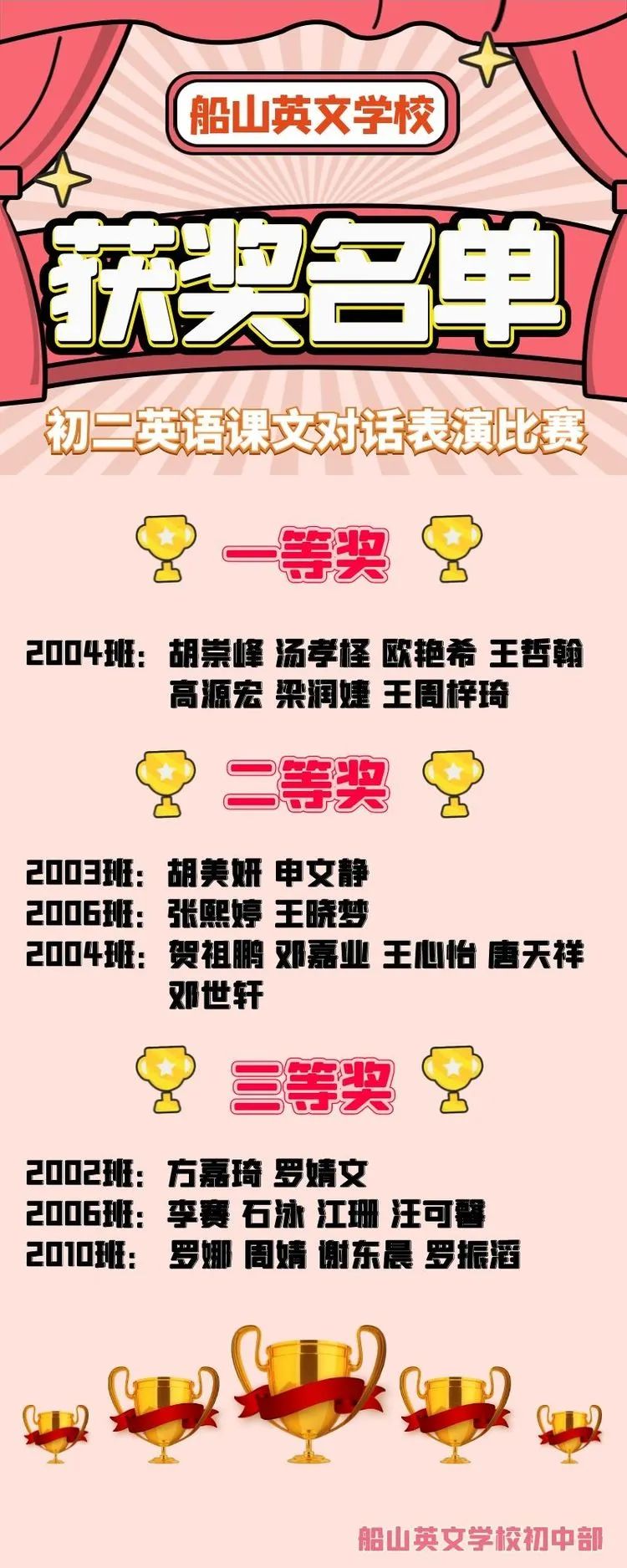 3月28日,船山英文学校初二年级英语组在中学部一楼多媒体教室举行了“英语课文对话表演”比赛活动,初二年级10个班级参与了这次活动。 赛前,外教Manda激情洋溢的讲话催发了每位参赛选手的夺冠斗志。 接下来的比赛按照抽签的先后顺序进行。 小演员们那标准而流利的英语口语与每一个表情动作以及舞台道具的配合,将在场的观众带进了一个个精彩的小故事里。 参赛节目内容丰富,既有经典的课本对话,电影桥段配音,也有学生的自编剧本。 小演员们自信大方的台风与惟妙惟肖的表演激起了观众席上一阵阵掌声与会心的笑声。 比赛结束后,评委组公布获奖名单。 英语组教研组长王津京老师代表评委组对本场比赛做出了精彩的点评,对获奖的学生表示祝贺,对初二全体学生提出了殷切的希望,希望他们把追求卓越的比赛精神贯彻到平时的学习中,将英语学习融入生活,常说英语,常用英语,彰显船英学子的英文特色。