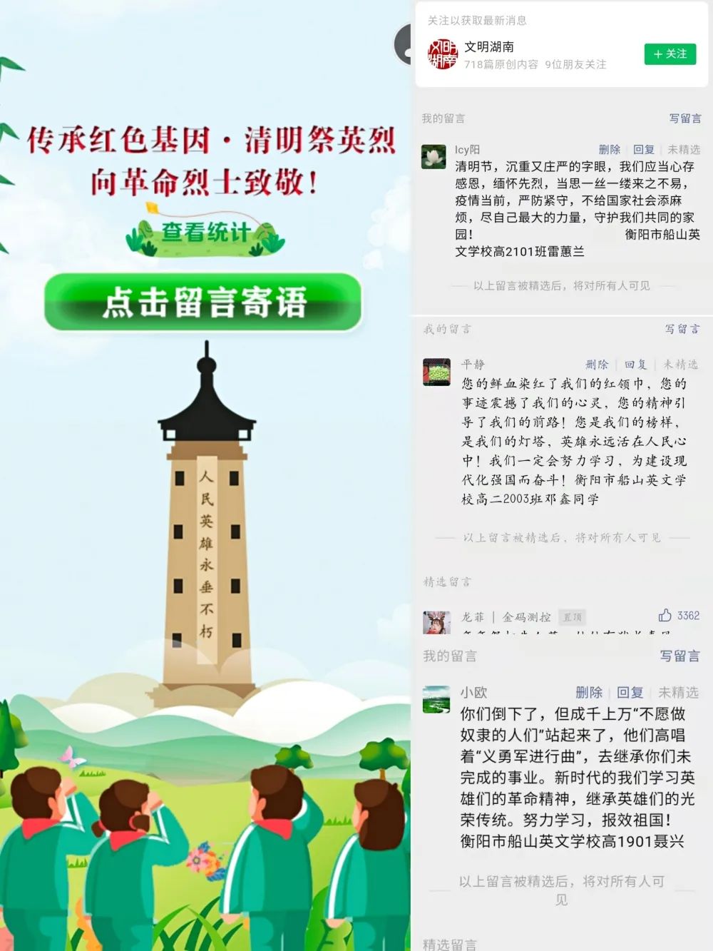 序春草绿,又到清明。我校开展了关于“清明节”的主题教育系列活动,让孩子们更好认识传统节日的同时,也弘扬了爱国主义精神,激发青少年对革命先烈的深深崇敬和怀念之情。 适逢抗击新冠肺炎疫情的特殊时期,为贯彻落实市委市政府关于清明节期间疫情防控工作的部署要求,船山英文学校依托湖南文明网,开展“传承红色基因*清明祭英烈”网络教育活动,号召全体师生积极参加网络祭奠,缅怀革命先烈,传承红色基因。 学校组织同学们一起“网上祭英烈”。 知清明 让同学们了解清明节的风俗, 知道清明节有扫墓,放风筝,吃青团,踏青等传统。 此次清明主题系列活动,是一次爱国主义教育、革命传统教育和感恩教育。此次活动,不仅让学生更清楚地了解先烈英雄事迹,而且让学生深刻地体会今天幸福生活的来之不易,让学生在汲取先烈的力量中,思想受到洗礼,心灵得到净化!