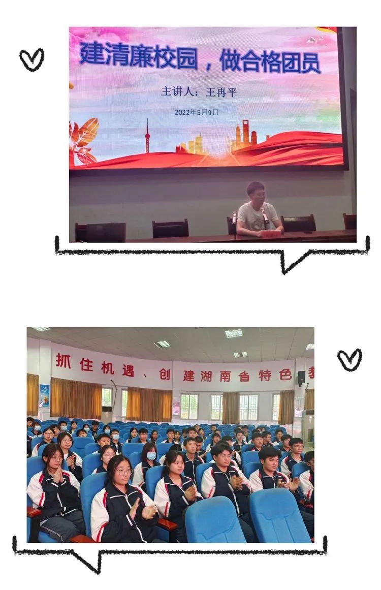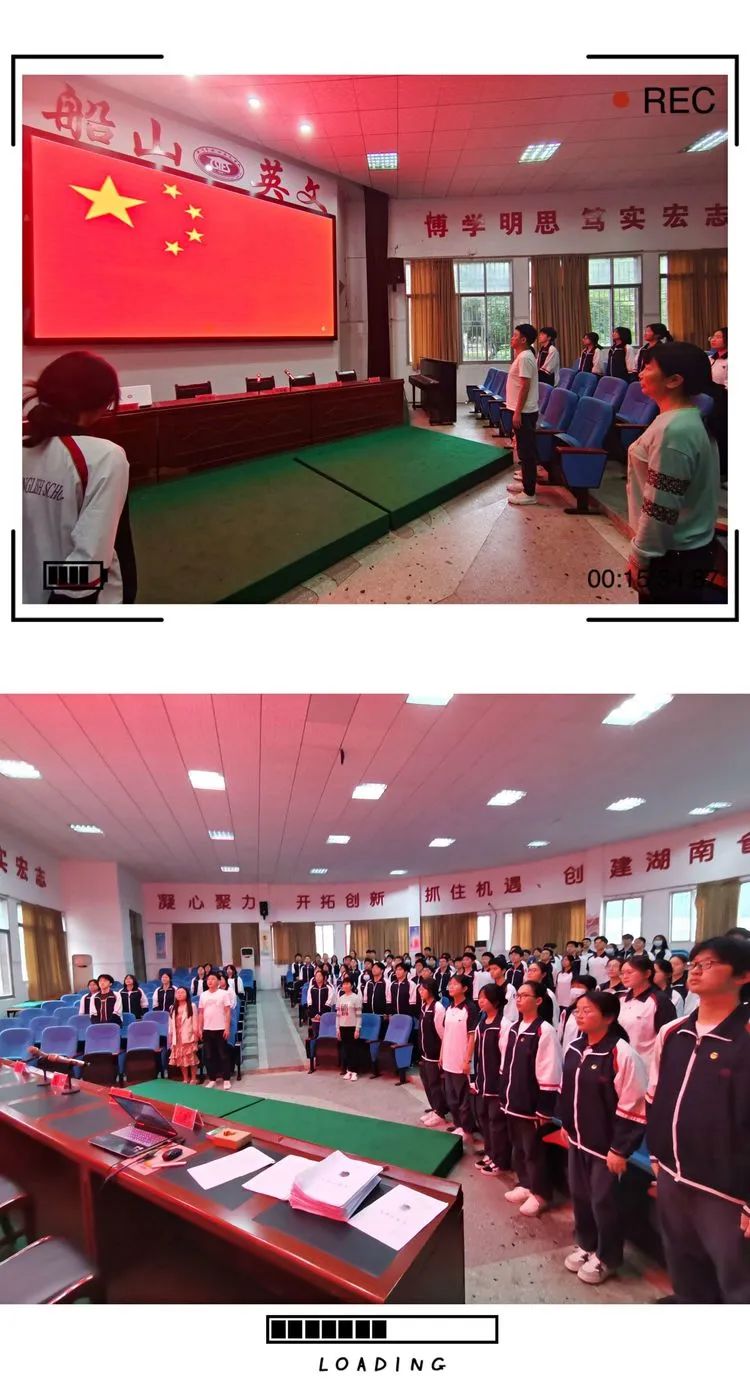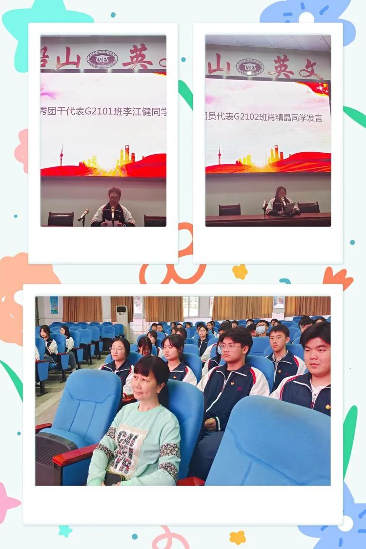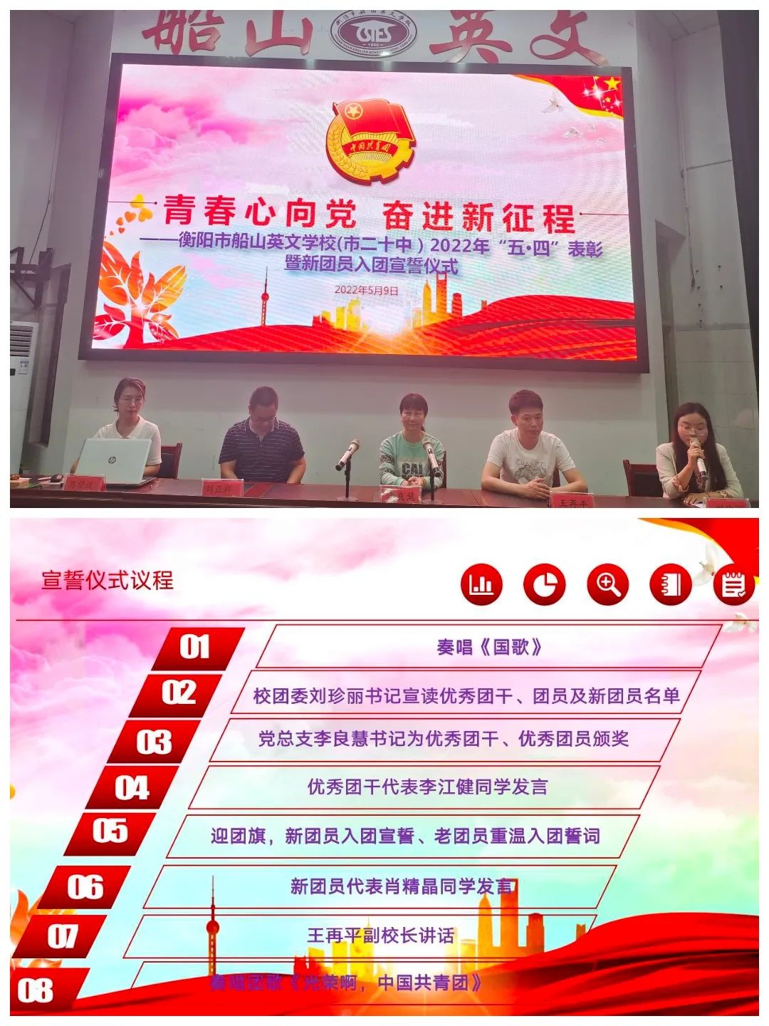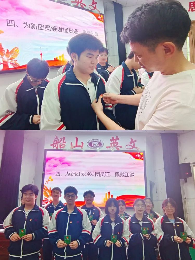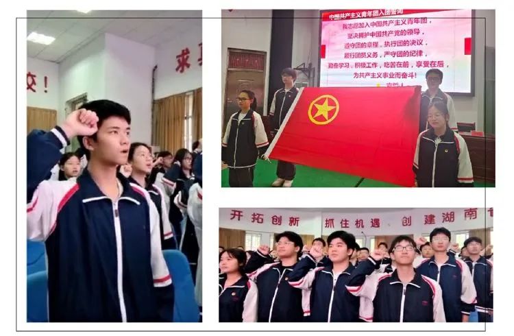 在中国共产主义青年团成立100周年之际,为了更好树立青少年的理想目标,厚植爱国主义情怀,进一步践行社会主义核心价值观,努力培育有理想、有本领、有担当的社会主义建设者和接班人,衡阳市八中教育集团船山英文学校隆重举行了2022年度“五四”表彰暨新团员⼊团宣誓仪式。学校党总支李良慧书记,王再平副校长,学生成长中心刘亚辉主任、陈望远副主任和来自全校的新、老团员代表参加了本次活动,仪式由校团委刘珍丽书记主持。 仪式在庄严的国歌声中拉开序幕 李良慧书记为优秀团干和优秀团员颁奖 G2101班的李江健同学作为优秀团干代表发言,他号召新团员们从现在做起,从小事做起,关心时事政治,立志成为一名优秀的共青团员。G2102班的肖精晶同学代表全体新团员发言,她用热情洋溢的发言抒发了新团员们心中的喜悦和自豪。同时,她号召全体团员要严格要求自己,认清方向,坚定前行,以青春之我,逐华夏之阳。 王再平副校长为新团员颁发团员证并佩戴团徽 各位新团员面向团旗、右手握拳举过肩,在团旗下庄严宣誓,大家铿锵有力地说出自己成为新团员的心声,立志做一名优秀的共青团员。誓言代表的不仅是一种精神,更是一种责任与担当,船英学子的铮铮誓言,彰显着新时代青年的青春热血与为团组织事业贡献力量的坚定信念。 王校长作题为《建清廉校园,做合格团员》的主旨讲话。他表示,青年是引风气之先的社会力量,共青团是先进青年的组织,团员青年应该有先进性,有光荣感。他对新发展团员寄予三点希望:一是珍视团员身份,为建清廉校园发挥榜样作用;二是赓续红色血脉,接好传承“接力棒”;三是融入大局大势,走好奋进“新征程”。王校长期许团员青年珍惜荣光,不负韶华,不负时代,在青春的赛道上奋力奔跑,争取跑出当代青年学生该有的风貌,为迎接党的二十大顺利召开献礼! 在全体师生嘹亮的《光荣啊,中国共青团》的团歌声中,此次入团宣誓仪式到此结束。 入团,只是人生的起点,当好先进青年,还要靠团员们不断实践。愿本次新入团的团员们,可以凝聚团体的力量,共筑属于他们的青春梦想!