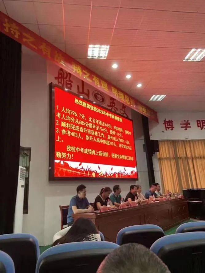 三年蜕变 今朝圆梦 7月7日,船山英文学校全体教职工齐聚求真楼一楼多媒体教室,召开2022年中考质量分析会。 主持台显示屏上,一个个数字闪耀着船英人的喜悦与自豪:学校初三学生人均达797分,比去年提高62分,比三年前提高了111分…… 会上,学校领导为初三全体教师献花,对他们的辛勤付出表示感谢,对他们的优异战绩表示祝贺。 “我为你们感到骄傲,你们又一次再创中考历史新高;我为你们感到高兴,你们已经把船英打造成了雁城之北一所品牌学校……”欧立平校长满怀激情地在会场上为教师们点赞,每一个船英人脸上都洋溢着幸福与快乐。