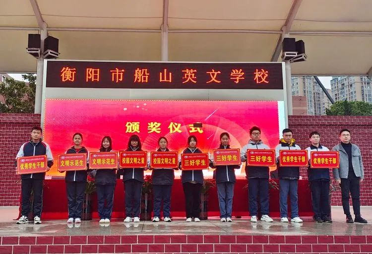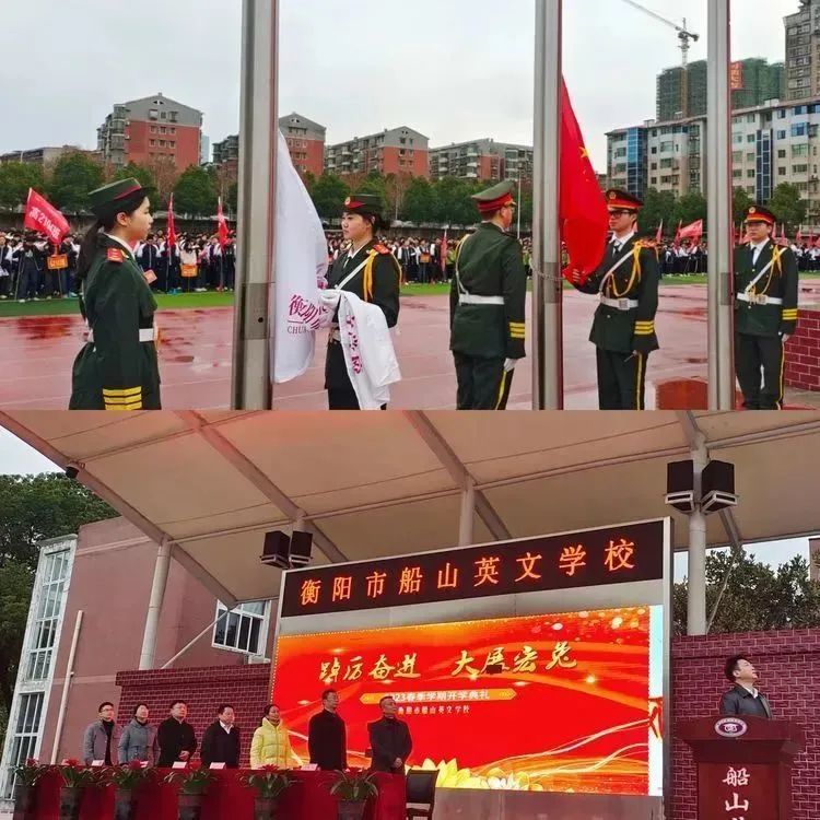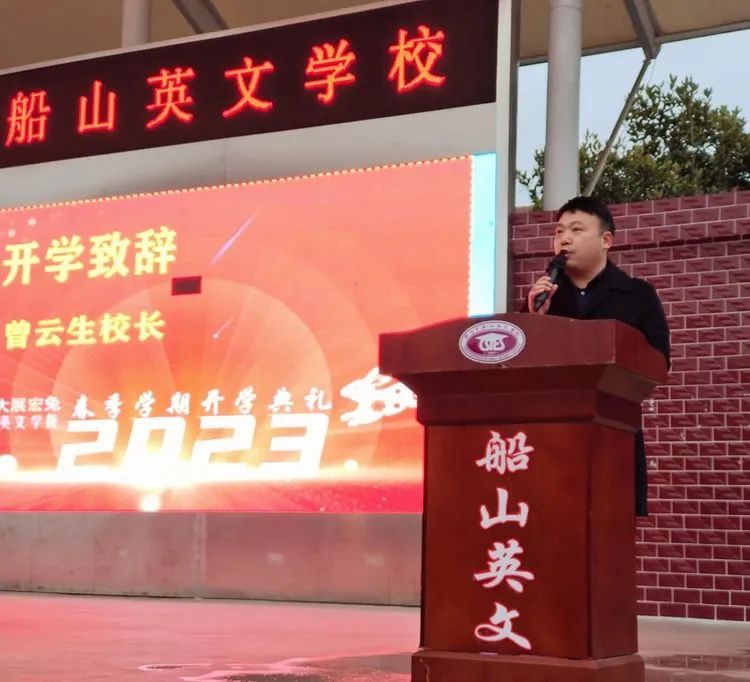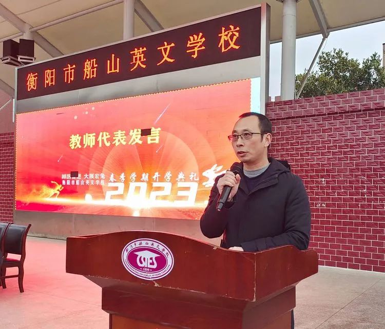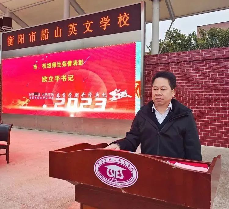 草长莺飞二月天 拂堤杨柳醉春烟 生命在茁壮成长 梦想在蓄势待发 让我们迎着春光 眺望山河远阔 齐心携手向未来 打造“雁城北片最具影响力的学校”! 2月13日上午8:08分,我校2023年春季开学典礼在运动场隆重举行。学校党总支书记欧立平、党建工作指导员李良慧、校长曾云生、副校长尹春、纪检委员彭青、副校长王再平、党总支副书记邓怡龙、副校长颜一新莅临典礼现场。副校长王再平主持开学典礼。 国旗冉冉升,激情少年志;国歌声声唱,自豪中国心。注视着猎猎飘动的国旗,倾听着雄壮激荡的国歌,全体师生精神焕发,激情满怀。在一片祥和喜庆中,衡阳市船山英文学校2023年春季开学典礼暨表彰大会隆重开幕。 扬帆起航,奋发“兔”强新征程 青春正当时,最美船英人!曾云生校长为新春开学典礼致辞。他用精准的数据总结了学校教育教学取得的各项成绩,向全体师生宣讲学校新拟的三年发展规划——打造雁城北片最具影响力的学校,并围绕着这一目标提出期望。曾云生校长寄语同学们:要对生活、对学习充满热爱,让“热爱”成为我们生活的主旋律。“非热爱无以致极,非坚持无以永恒”,在热爱中感受生活之美,在热爱中培养健全的人格,在热爱中铸就自己的风骨;要让理想成为我们精神的主旋律。理想是晨星指引,是矢志不渝,是成长路上的不懈坚持;要让知识成为我们创造的主旋律。希望同学们以知识涵养人生,让知识成为创新成长源泉,追求知识高地,让自己的人生散发出耀眼的光芒。 表先进 树榜样,“兔”围而出 欧立平书记宣读“衡阳市优秀教师及先进个人”“衡阳市优秀学科教师”“衡阳市优秀班主任”教师表彰名单、学生表彰名单。 与君共勉,“兔”飞猛进 高中部阳海斌老师代表全体教师发言。他用朴素简洁的言语,抒发了全体老师喜迎新学期,奋斗新征程的教育情怀;表达了不负时代使命,永葆教育本色的决心;同时,他深情寄语广大同学:心怀理想,勤奋学习,勇于创新,争做时代好少年! 待你归来,前“兔”似锦 2007班的席玉麟同学代表全体学生发言。席玉麟同学是船山英文学校以小初高贯通式模式培养出来的优秀代表,他畅谈了自己成长在“花藤爬满墙”“池亭菡萏香”的美丽船英的美好体验,表示要永远怀揣着“为中华崛起而读书”的宏图远志,决心高筑理想,勤学深思,积极进取,做人生追梦人,时代开拓者。不负师友,不负学校,不负国家,不负未来!他号召所有同学们坚定信心,矢志求真,以奋斗为经,理想为纬,织就青春灿烂如锦;以汗水浇灌,刻苦为基,铸就人生华美如诗! 青春飞扬,大展宏“兔” 新年新景,新岁新进,寒尽春来又一新,笑看我学铿锵行!让我们扬帆起航,乘风破浪,如兔脱跃而起,如鹰飞扬而上,以青春之姿,舞出船英最美风采,以奋进之声,唱响船英最亮旋律!