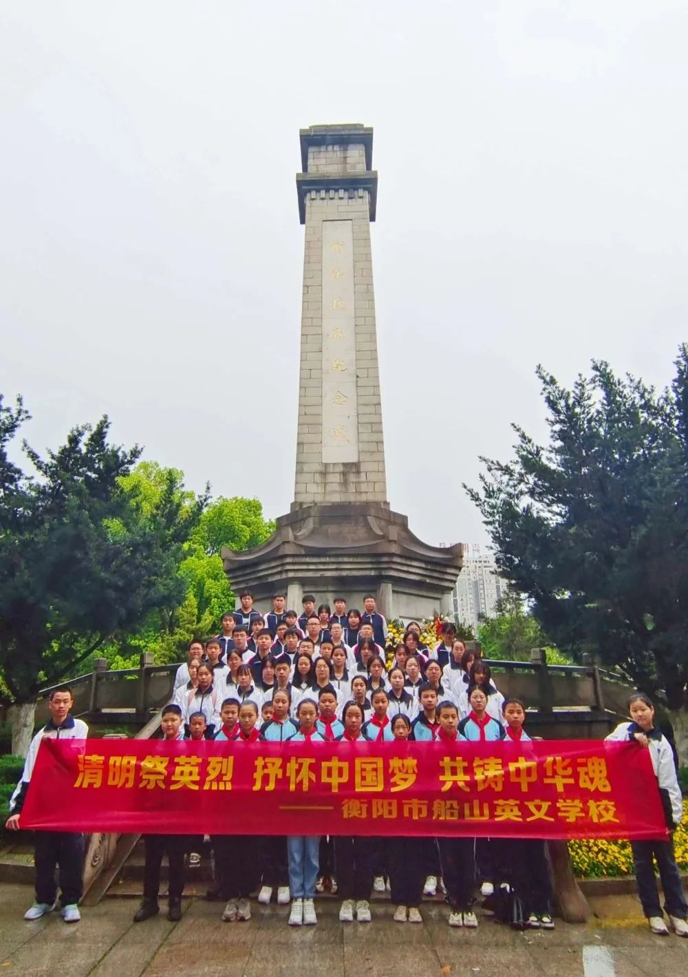 青松滴翠寄深情。 无限哀思无限情, 清明时节祭英雄。 “春风拂青松,清明祭忠魂。”在清明节来临之际,为追思英烈,弘扬革命精神,赓续红色血脉,4月3日上午9点,衡阳市船山英文学校各班级学生代表,在校团委的带领下,来到衡阳市岳屏公园抗战纪念碑前开展“清明祭英烈,情怀中国梦,共铸中华魂”红色祭扫主题教育活动。