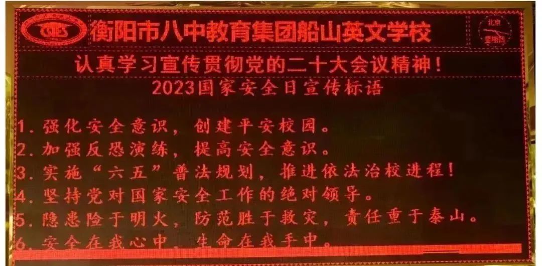 2023年4月15日是第八个“全民国家安全教育日”。为深入贯彻落实教育部、省市教育行政部门统筹推进国家安全宣传教育工作的文件精神,切实增强师生国家安全意识,不断强化全民国家安全责任,衡阳市船山英文学校围绕“贯彻总体国家安全观,增强全民国家安全意识和素养,夯实以新安全格局保障新发展格局的社会基础”的主题,4月10日至4月15日期间,在全校范围内积极开展了一系列“4·15全民国家安全教育日”宣传教育活动,收到了良好的社会的反响。