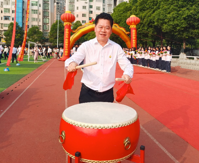 东风吹,战鼓擂。在欧立平书记的带领下,曾云生校长和副校长王再平、莫国冰及高中部许秋莲校长为高三学子擂响高考的战鼓。现场气势如虹,志气高昂。高三所有同学在阵阵战鼓声中,挥舞着手中的旗帜,慷慨激昂地冲向象征胜利的凯旋门。在场的所有师生和家长都被高三学子的激情所感染,他们用掌声和呐喊为这群青春飞扬的少年鼓劲加油。