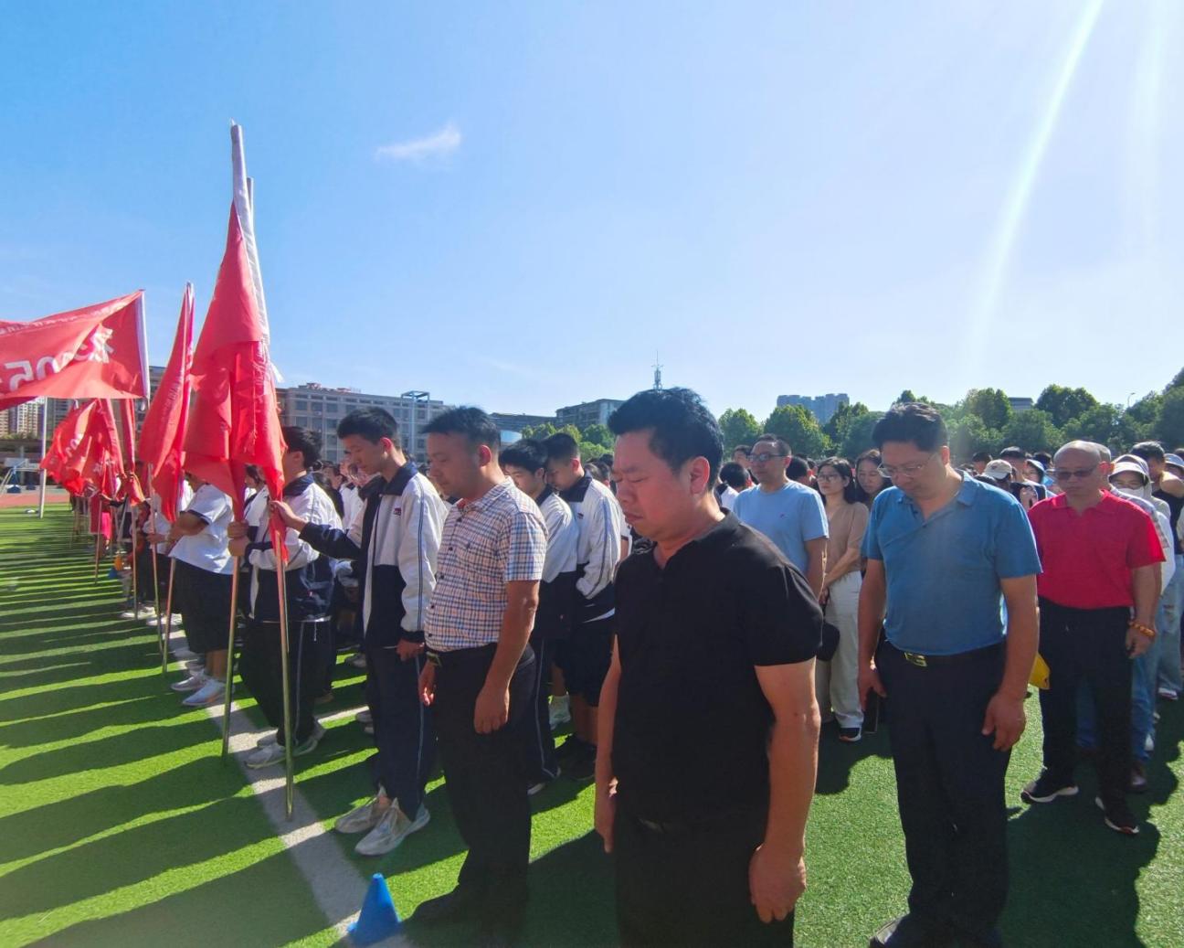仪式伊始,鲜艳的五星红旗伴随着庄严的国歌冉冉升起,全体师生神色肃穆,注视着用无数革命先辈们用鲜血染红的旗帜。而后,在学校党总支书记欧立平和校长曾云生的带领下师生集体默哀,致敬英烈。