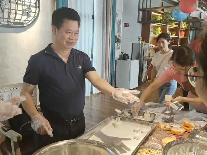 最开心的是大家自己动手现场制作月饼。用英语交流着的老师们捏起一个个面团,细心填入一团团馅料,互相帮助,指尖翻飞,晶莹美丽的月饼便显了形状。做好的月饼可以现吃,也可以装入精致的月饼盒中带回家慢慢品尝。枣泥、莲蓉的甜味环绕着整个雅园。