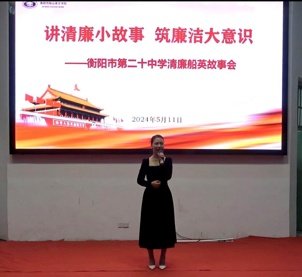 为创建“清廉船英故事会” 特色品牌,持续推进清廉学校建设,彰显“爱满船英 廉润船英”理念,打造风清气正的教育环境,在党总书记欧立平、校长曾云生的指导下,由副科级纪检员李伟平负责策划的衡阳市第二十中学(船山英文学校)“清廉船英故事会”第一期于2024年5月11日下午在初中部阶梯教室正式开讲。