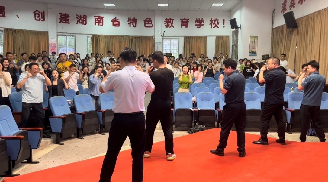 小学部体育组申昌盛老师为大家带来了精彩的双截棍表演,并现场示范教学,带领学校领导与全体教职员工学习了一套防身拳术,鼓励大家要长期坚持、加强锻炼、强健体魄。