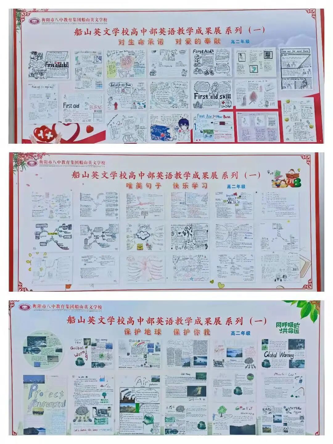 高二年级的主题则更多样化。“对生命承诺,对爱的奉献”;“唯美句子,快乐学习”;“保护地球,保护你我”,这些主题虽然不一致,但它们传递的精神是相同的:爱——爱生命,爱学习,爱地球。