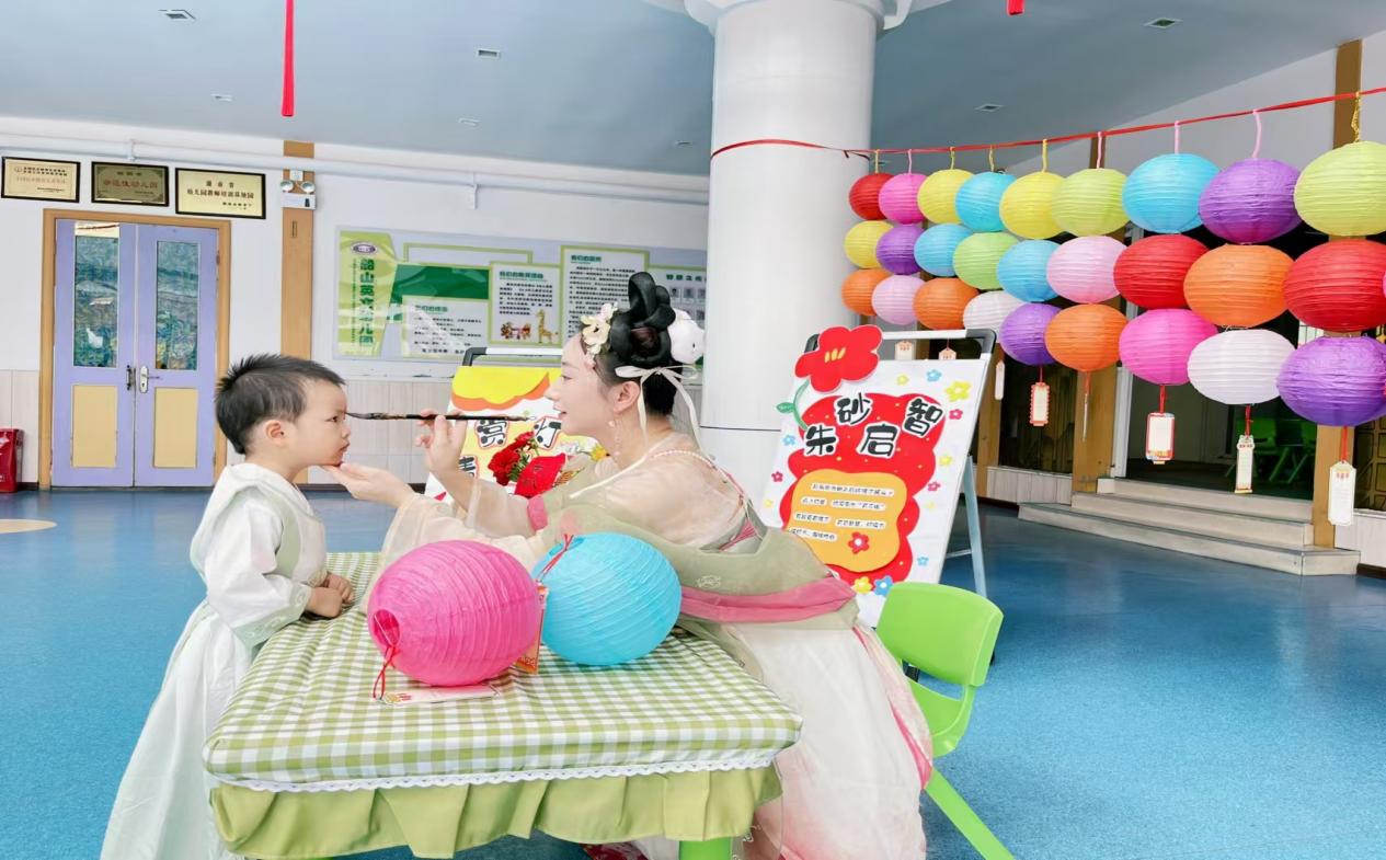 在“朱砂开智”这一特别仪式上,小班的小朋友们身着可爱的汉服,脸上洋溢着纯真无邪的笑容,静静地等待老师们点痣。老师们轻轻地拿起承载着传统与祝福的朱砂笔,小心翼翼地在每个孩子光洁的额头上点下一颗颗鲜艳的红痣。眉心的红痣不仅仅是外在的点缀,更是老师们对孩子内心智慧与潜力的一种唤醒与期许。孩子们瞪大眼睛,好奇又兴奋地观察着同学们额头上的新变化,随后纷纷伸出手,轻轻地触摸那点红,眼中闪烁着对成长之路的美好憧憬与无限期待。