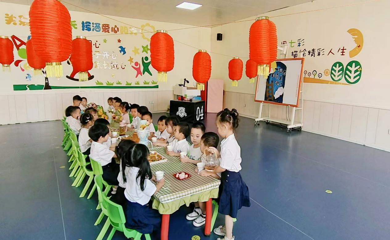 中班的小朋友们围坐装饰典雅的茶歇区。桌上琳琅满目的月饼与古朴精致的茶具相映成趣。小朋友们或低头细品月饼的香甜,或举杯轻啜花茶的清新。他们相互分享着各自的月饼口味,交流着对节日的期待与感受,欢声笑语此起彼伏。